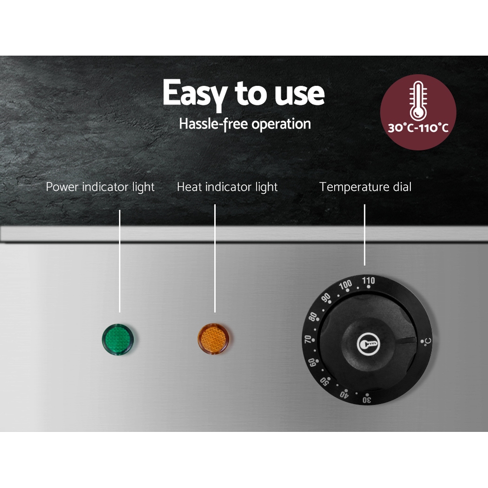 Keep pre-cooked food perfectly warm or gently cook delicate dishes with the Devanti Commercial Food Warmer Bain Marie. Featuring three removable food-grade stainless steel pans and a removable water bath, this bain marie uses U-shaped heating elements to provide fast, even heat adjustable between 30°C and 110°C. The high-transparency tempered glass doors and non-slip rubber feet ensure safety and convenience, while the drain tap allows easy water removal. Ideal for buffets, catering, takeaway eateries, or large home gatherings, it delivers professional-quality temperature control with simple operation and easy cleaning.