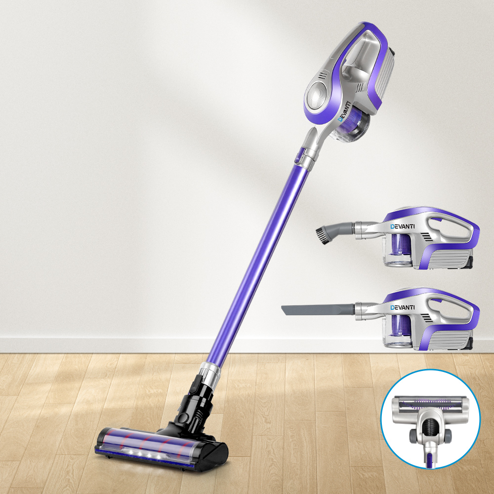 Devanti Cordless 150W Stick Vacuum Cleaner, Purple/Grey - Motorized Roller, HEPA Filter, 25 Min Runtime