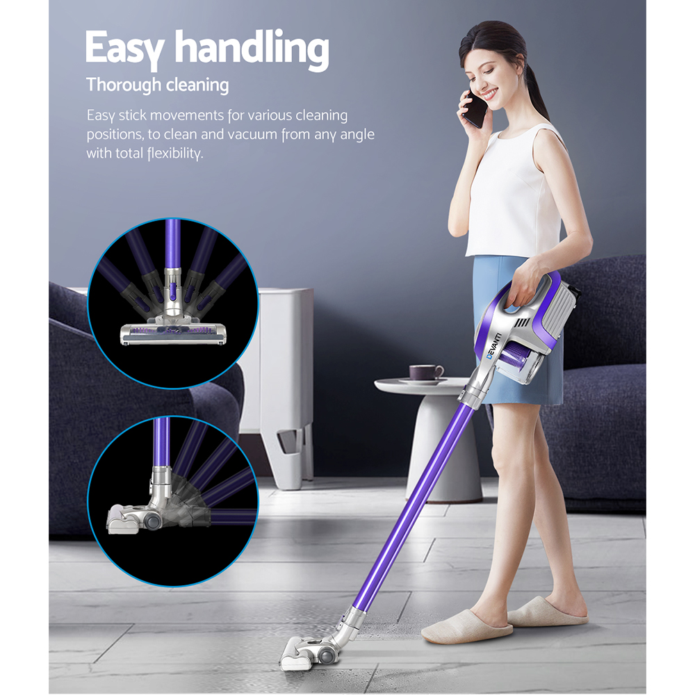 Introducing the Devanti 150W Cordless Handstick Vacuum Cleaner in a sleek purple and grey design. Engineered for efficiency, it features a motorized roller head with a tangle-free design and soft roller for gentle cleaning. The pivoting head with tilt and angle adjustment makes manoeuvring easy, while the LED headlight brightens dim spaces. Powered by a 2000mAH lithium-ion battery, enjoy up to 25 minutes of uninterrupted cleaning. The HEPA filter captures 99.97% of dust and allergens, ensuring a cleaner home. Lightweight and cordless, it's perfect for quick and thorough cleaning sessions.