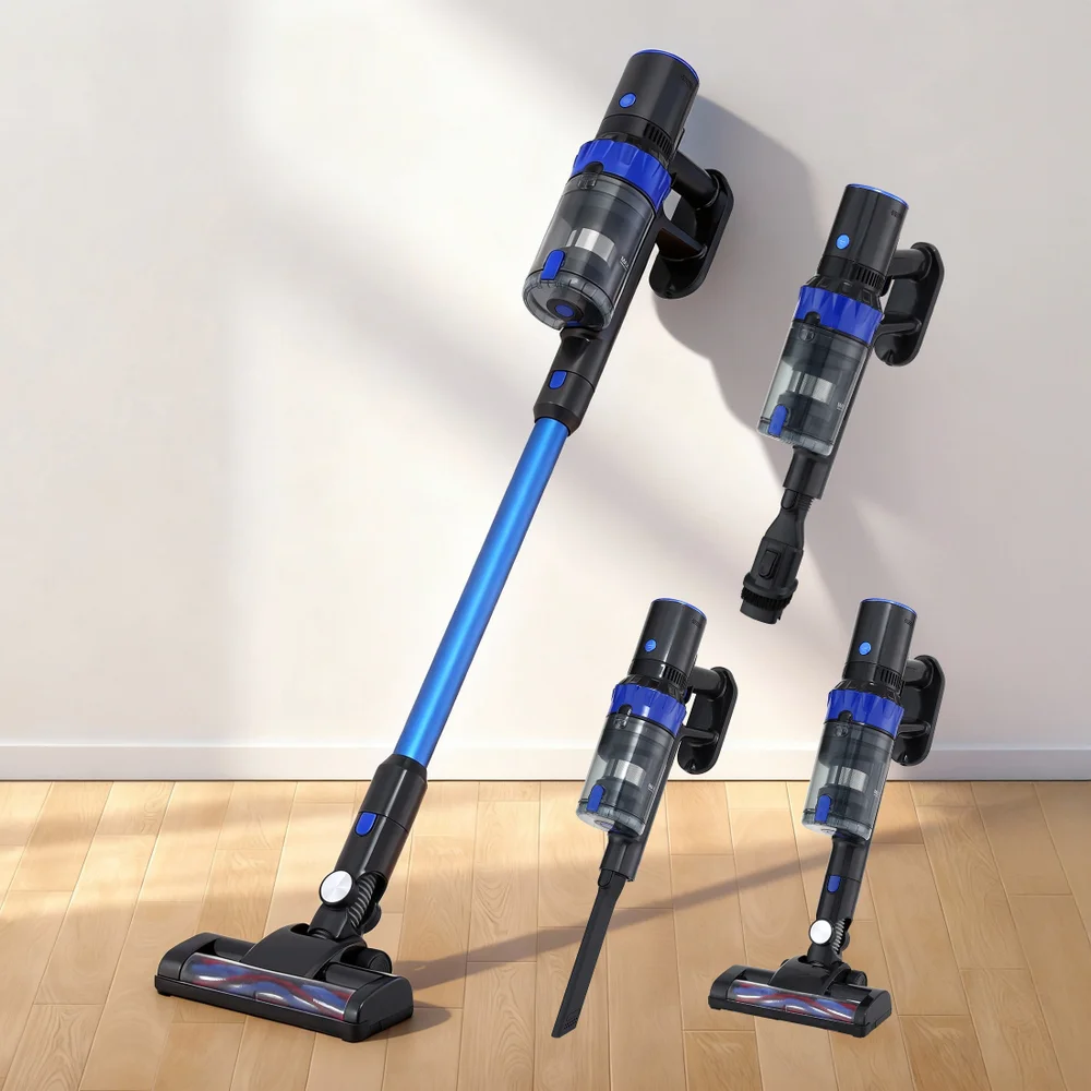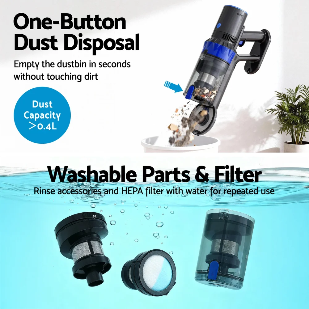 Experience unparalleled cleaning efficiency with the Devanti Stick Vacuum Cleaner Brushless Cordless 350W in Blue. This lightweight, cordless vacuum offers 22KPa strong suction with adjustable two-speed modes, powered by an upgraded brushless motor for quieter, more energy-efficient operation. Its, 2000mAh rechargeable Li-ion battery ensures up to 40 minutes of runtime, making it perfect for whole-home cleaning. Effortlessly navigate tight corners and low spaces with its swivel head and flexible design. The vacuum's bagless system with a washable HEPA filter captures up to 99.97% of dust and allergens, ensuring a cleaner home environment. Versatile and user-friendly, it includes essential accessories and a convenient wall-mounting holder for easy storage.
