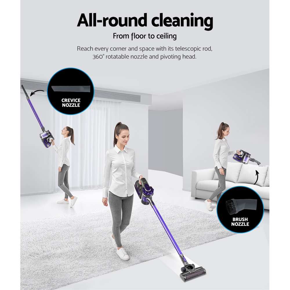 Introducing the Devanti Stick Vacuum Cleaner Cordless HEPA Filter in Purple—a versatile cleaning solution that effortlessly transitions from a stick to a handheld vacuum. Powered by a robust 150W motor with 30000rpm, it delivers consistent suction power up to 8000Pa. Its 160-degree swiveling head and multifunction nozzles make cleaning carpets, rugs, hard floors, upholstery, and curtains a breeze. Designed for convenience, it features a lightweight, one-handed, bagless design with a washable HEPA filter that captures 99.97% of dust and allergens. Enjoy up to 35 minutes of cordless cleaning with its 2000mAH rechargeable battery.