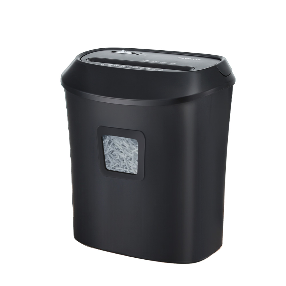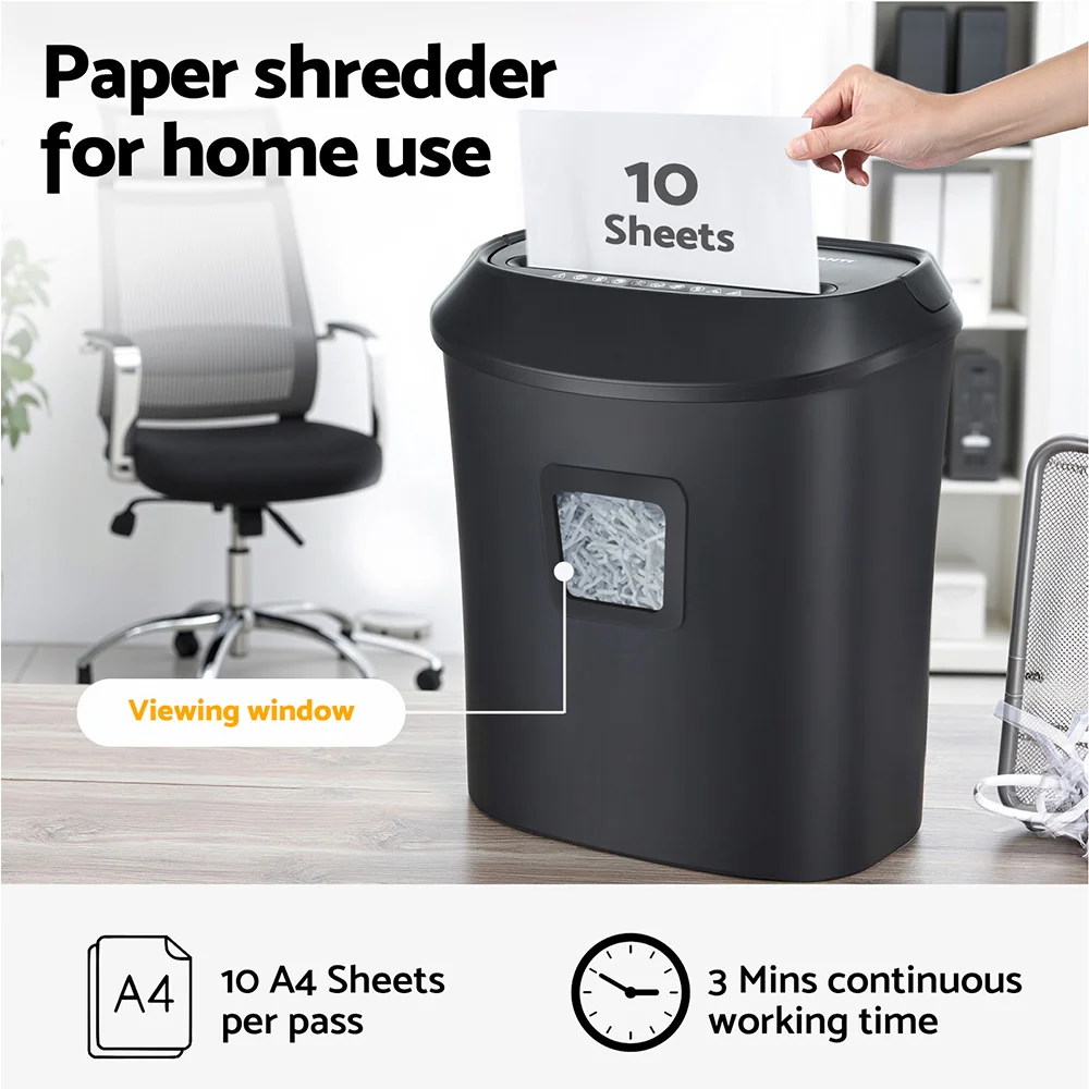 Enhance your document security with the Devanti Electric Paper Shredder, perfect for both home and office environments. This heavy-duty shredder can handle up to 10 A4 sheets and credit cards, with an optional CD/DVD shredding feature. Equipped with cross-cut technology, it ensures your sensitive information is thoroughly destroyed. The 21L bin with a viewing window allows for easy monitoring, while the reverse function, auto stop, and overheat protection provide seamless operation. With a 3-minute continuous use capacity and an easy lift-off head, it combines efficiency with convenience. Enjoy peace of mind with a 1-year warranty.