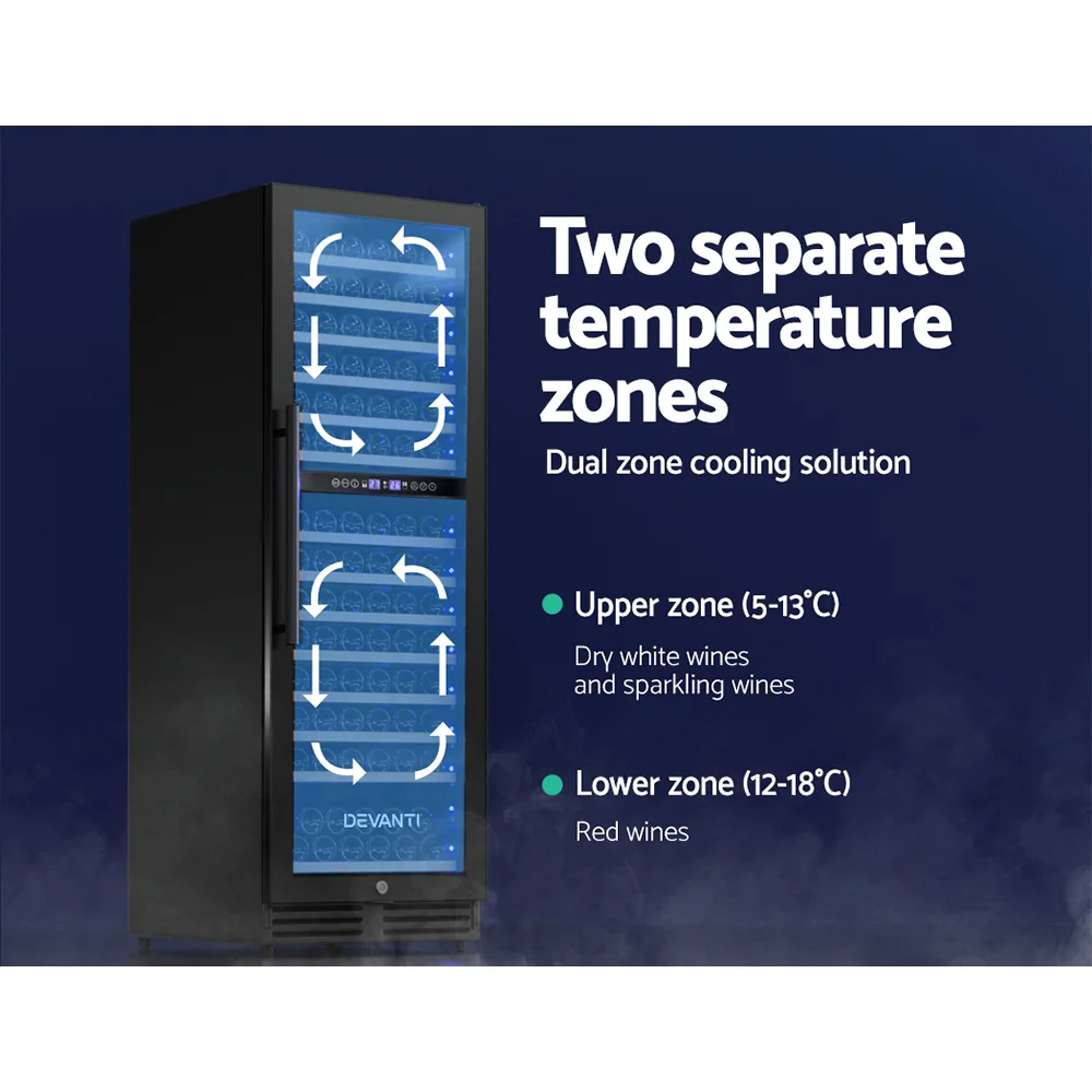 Devanti Dual Zone Wine Fridge Cooler - 128 Bottle Capacity, Compressor Cooling, LED Lighting, UV-Resistant Door