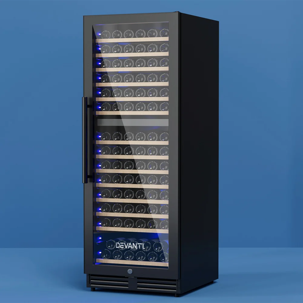 Elevate your wine collection with the Devanti Wine Fridge Cooler Dual Zone, designed to store up to 154 bottles. Featuring advanced Jiaxipera compressor cooling, dual temperature zones (5-13°C upper for whites, 12-18°C lower for reds), a digital control panel, UV-resistant double-glazed glass door, and stylish wooden racks. Silent, frost-free operation with built-in LED lights and lock ensures your wines are preserved and displayed perfectly, ideal for home or commercial use. Includes 1-year warranty.