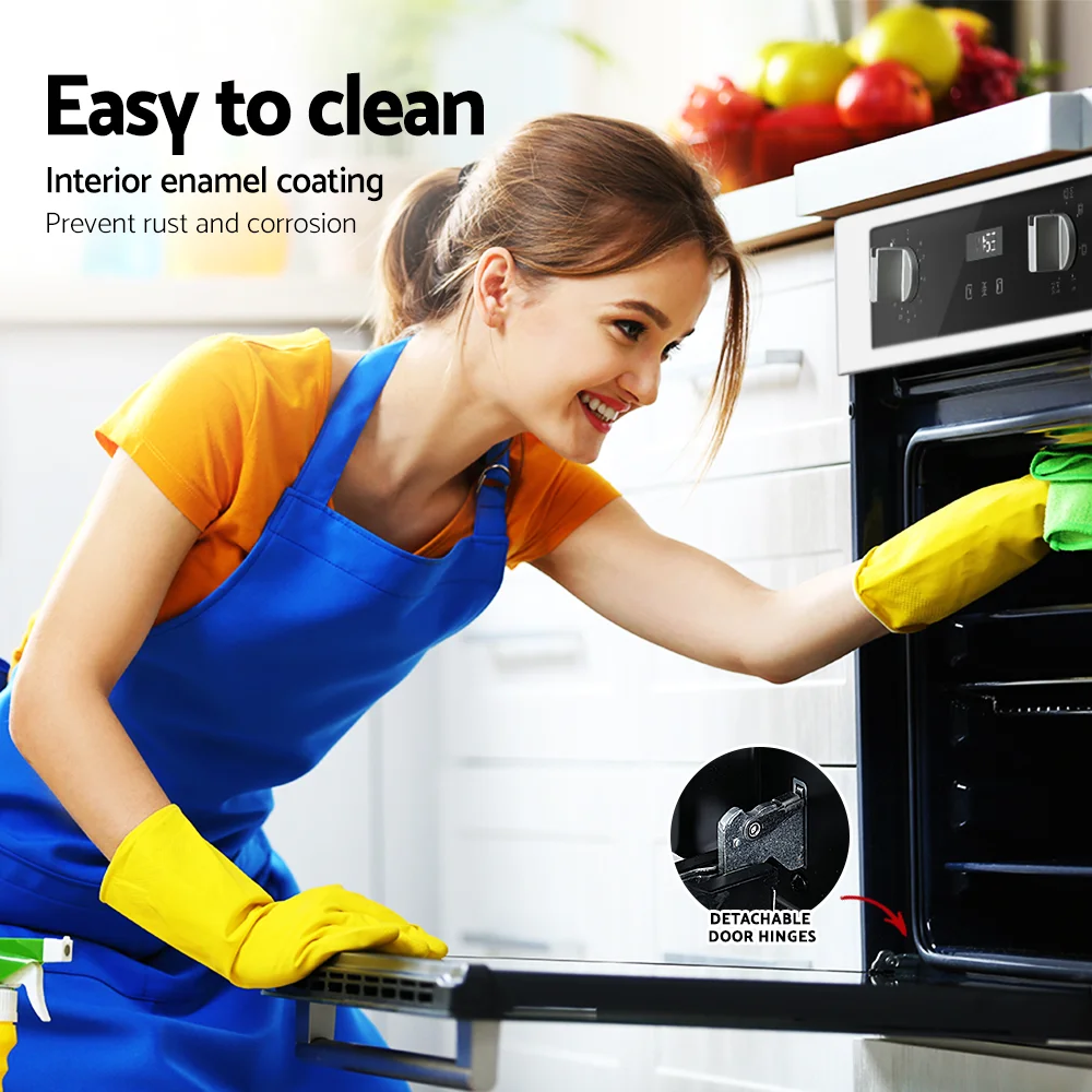 Introducing the Devanti Electric Built-In Wall Oven, a perfect fusion of style and functionality for your modern kitchen. This 80L convection grill oven is crafted from food-grade stainless steel, offering ample space for all your culinary creations. Benefit from 360° air circulation for evenly cooked meals and choose from 8 auto cooking functions to simplify your cooking experience. With user-friendly knobs, a sleek touch panel, and a wide temperature range of 50-250°C, this oven adapts to all your cooking needs. Safety is paramount with features like automatic shut-off, a cool-touch handle, and a heat shield vent. Effortless cleaning is ensured by the enamel cavity, removable side racks, and double-glazed inner door. Illuminate your cooking with the built-in light and monitor progress through the tempered glass viewing door. Elevate your kitchen with this SAA-certified, efficient, and easy-to-operate Devanti oven, complete with a 1-year warranty.