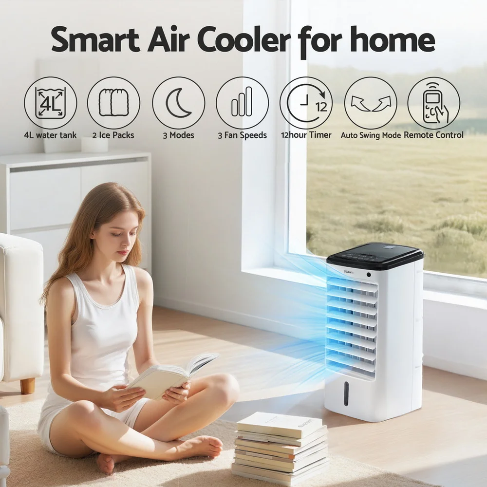 Stay cool and comfortable with the Devanti 3-in-1 Evaporative Air Cooler Conditioner with Remote. This sleek unit combines an evaporative cooler, humidifier, and fan to provide optimal comfort. The 4L top-fill tank makes refilling a breeze, while included ice packs enhance cooling on hot days. Customise airflow with 3 speed settings and 3 modes—Normal, Natural, and Sleep—and adjust the louvres for personalised comfort. Effortless operation is guaranteed with a remote control and auto-swing function, while the 2–12 hours timer ensures energy-efficient use. Designed for convenience, it includes a built-in ioniser to freshen the air and a portable handle for easy relocation, all while operating quietly and efficiently.