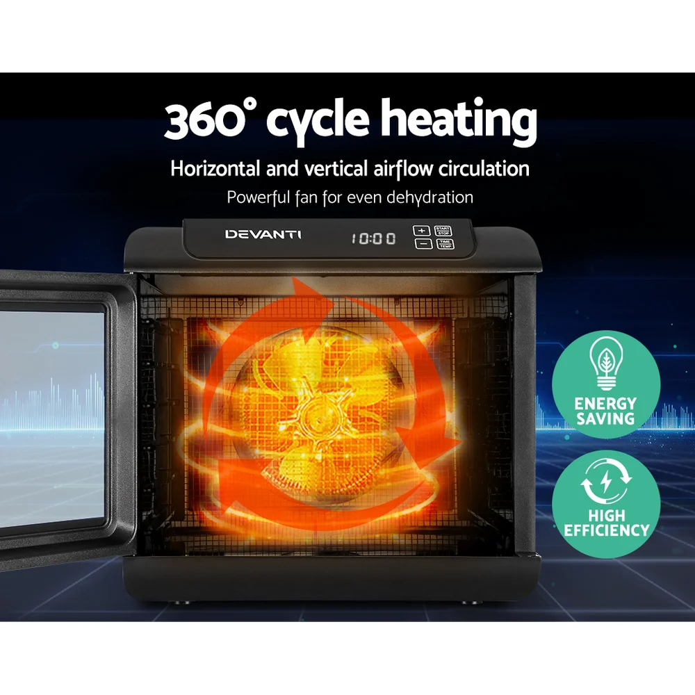 Introducing the Devanti 6 Trays Food Dehydrator, your go-to appliance for creating delicious, healthy snacks right at home. Whether you're into fruit, vegetables, herbs, or beef jerky, this dehydrator ensures optimal nutrient retention and extended shelf life. With six food-grade stainless steel trays, it offers a complete drying system featuring an LCD touch control panel for easy adjustments. The transparent flame-retardant door allows for convenient monitoring, while removable trays make cleaning a breeze. Safety is guaranteed with overheating protection and an SAA-certified plug. Experience effortless operation and healthy eating with Devanti.