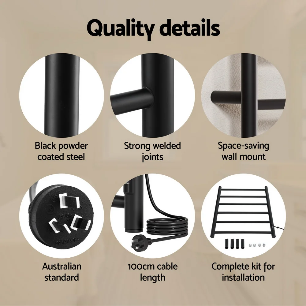 Devanti Heated Towel Rail 6 Bar Electric Warmer Rack, Carbon Steel, Black, Timer, Wall Mounted, Waterproof, 80W