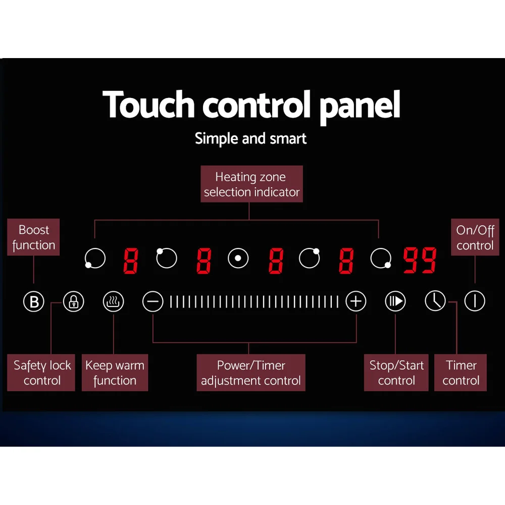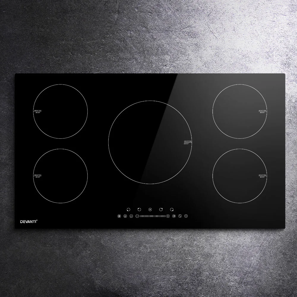 Devanti Induction Cooktop, Black Ceramic Glass, 90cm, 5 Zones, Touch Control, Safe & Efficient Cooking Solution