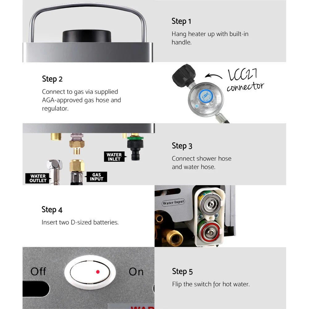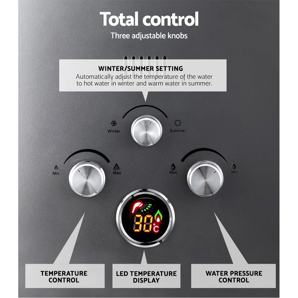 Devanti Portable LPG Gas Water Heater, 8L/min, Grey - Outdoor Shower Solution with LED Display & Safety Features
