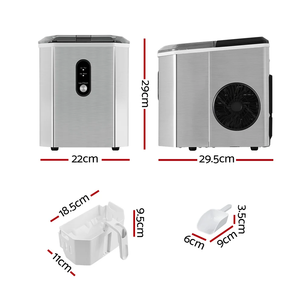 Devanti 2.4L Stainless Steel Portable Ice Cube Maker, 12kg/Day, 2 Sizes, Quiet, Freon-Free, Silver, Countertop