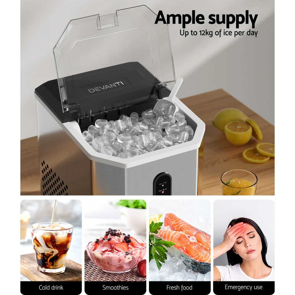 Devanti Stainless Steel Portable Ice Maker - 12kg Daily Capacity, Quick 6-13 Min Cycle, Compact Countertop Design
