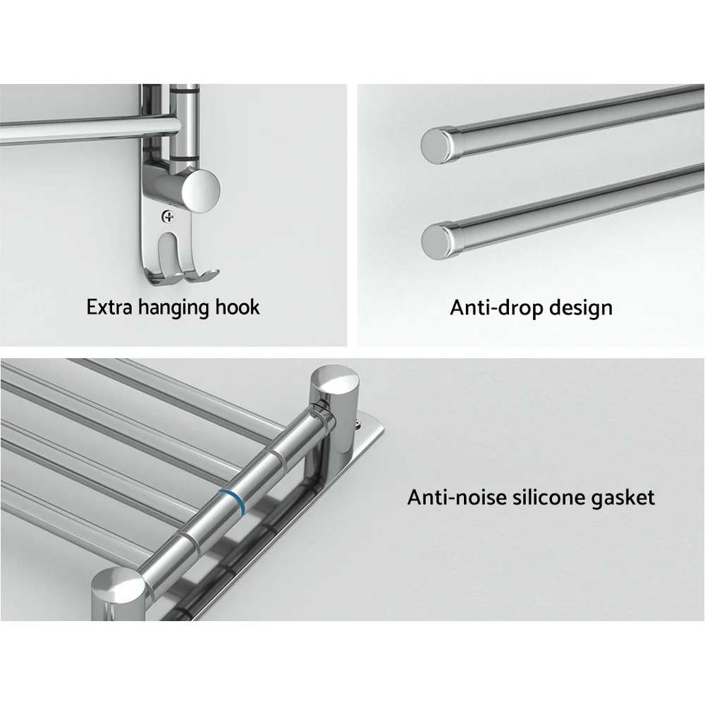Upgrade your bathroom with the Devanti Towel Rail Rack Holder, designed for a modern, clutter-free space. Crafted from rust and corrosion-resistant stainless steel, this wall-mounted rack features four 180° swivel bars for flexible storage, an anti-drop design to secure towels, and anti-noise silicone gaskets for silent use. An additional hanging hook adds versatility, and easy installation makes it perfect for your bathroom, kitchen, or laundry room. Enjoy sleek organisation and lasting durability with this elegant storage solution.