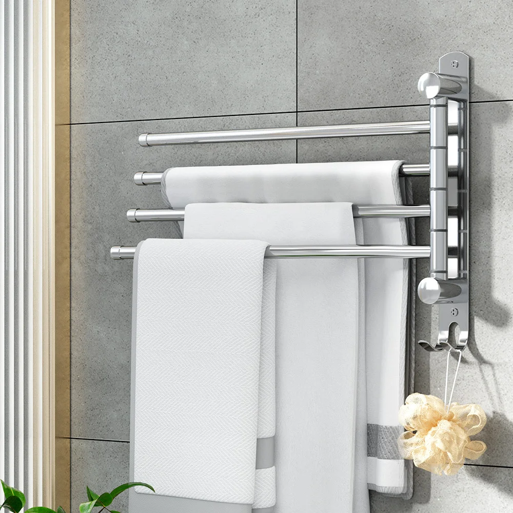 Devanti 4 Bar Stainless Steel Towel Rail Rack Holder, Wall Mounted Swivel Design with Hook, 36x25cm, Rust-Resistant