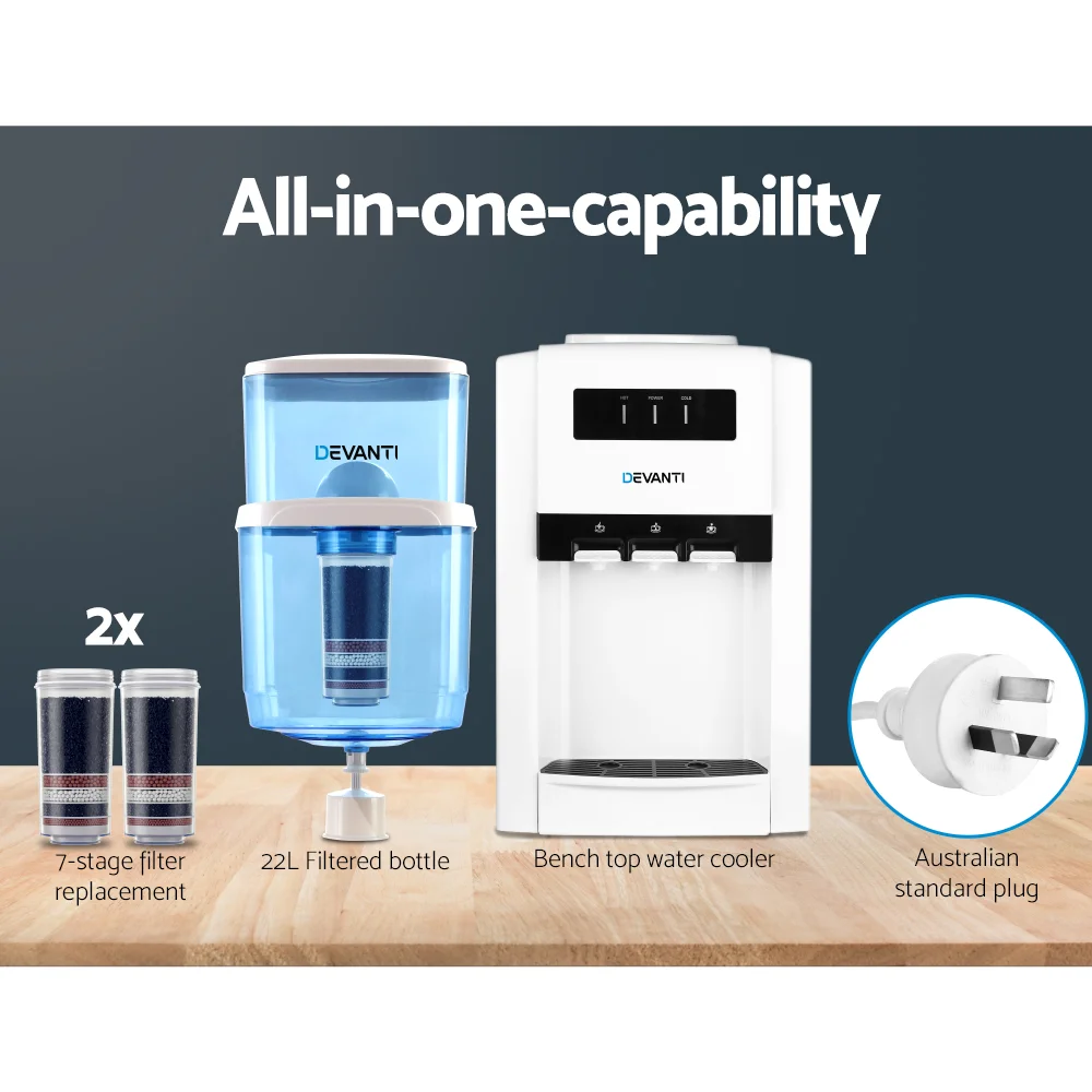 Devanti 22L Benchtop Water Cooler Dispenser with 6-Stage Filtration, Hot, Cold & Room Temp Taps, Food-Grade Plastic