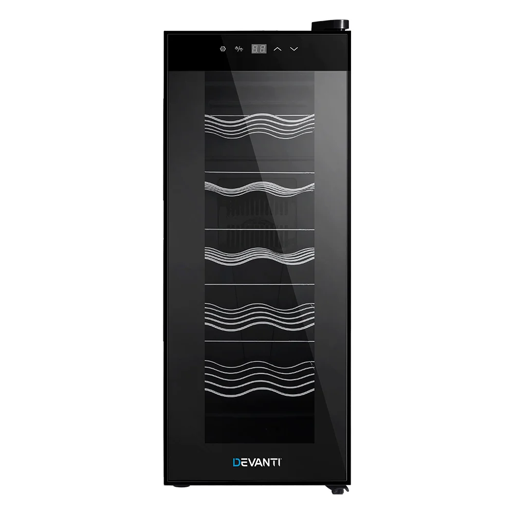 Devanti Wine Fridge Cooler, Thermoelectric, 12 Bottle Capacity, Black, 50x25.3x64.5cm, UV-Resistant, Silent Operation