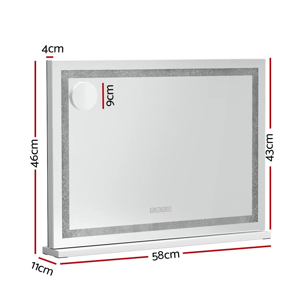 Transform your beauty routine with the Embellir Bluetooth Makeup Mirror. This 58x46cm Hollywood-style vanity mirror features dazzling LED crystal light strips that illuminate your face for flawless makeup application. Enjoy your favourite tunes with the built-in Bluetooth speaker and keep devices charged via the USB port. The touch controls let you adjust brightness and colour temperature to suit your needs. With a detachable base, opt for tabletop use or wall mounting. Elevate your space with Embellir.