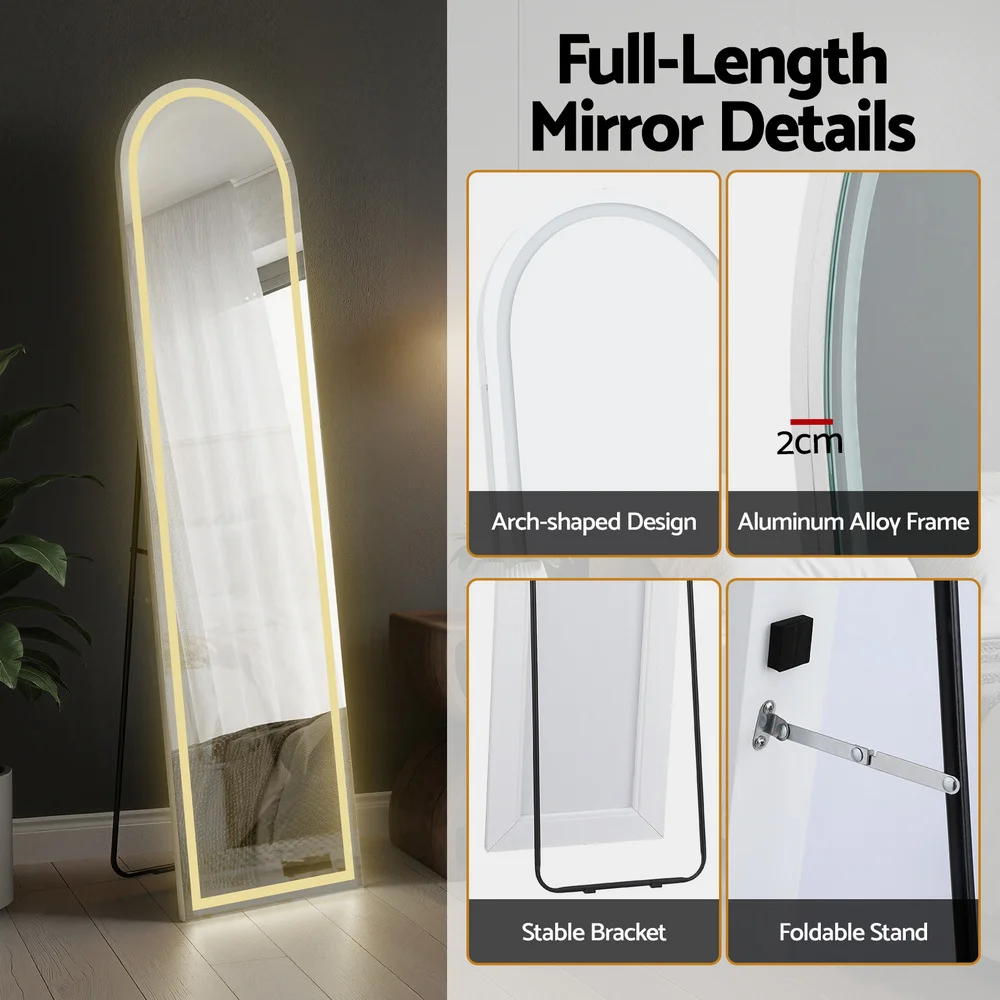 Transform your space with the sophisticated elegance of the Embellir LED Full-Length Floor Dressing Mirror. Standing at 160cm, this exquisite mirror is not only a functional piece but an artful addition to any room. Its adjustable LED light offers three-colour temperatures and stepless dimmable brightness, perfect for setting the mood in your bedroom or living room. The mirror's high-definition, shatterproof glass ensures a crystal-clear, full-body view, all framed in a premium aluminium alloy. Whether freestanding or wall-mounted, its modern arched design is a chic dorm essential and a stunning decor piece.