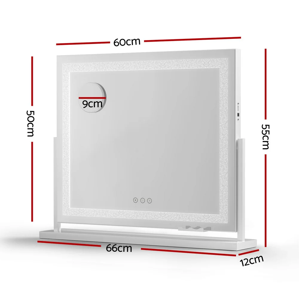 Introducing the Embellir Makeup Mirror, a luxurious addition to your beauty routine. With its expansive 60x50cm crystal LED surface and cutting-edge 'Shattered Diamond' lighting technology, this mirror provides unparalleled clarity and elegance. Customise your lighting with three professional colour temperatures and fully adjustable brightness to achieve flawless makeup application. The 360° swivel base ensures the perfect angle, while a side USB port adds convenience. Complete with a bonus phone holder and 10x magnifier, this modern, minimalist mirror is perfect for both professional and home use.