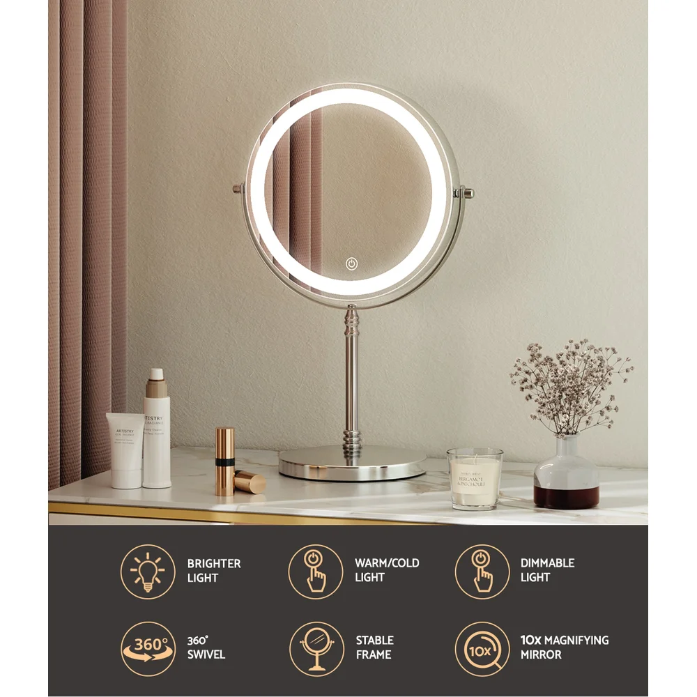 Elevate your beauty routine with the Embellir Makeup Mirror. This 20x20cm mirror offers 10X magnification and features 54 LED lamp beads for perfect illumination. Its sleek aluminium frame and stable metal base ensure durability and style. Easily adjust brightness and colour temperature with touch controls, choosing from cool white, daylight, or warm lighting. Transform your space into a celebrity VIP set with this versatile mirror, complete with 360° rotation and a 2000mAh rechargeable battery.
