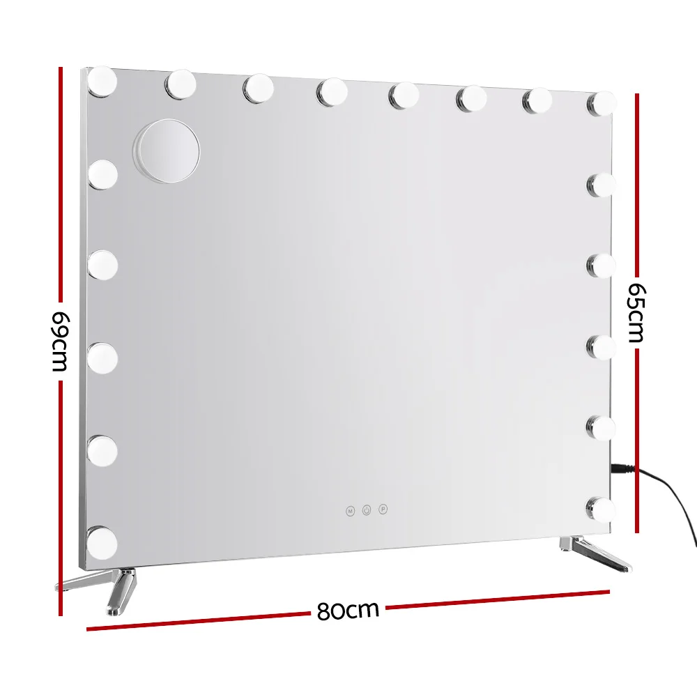 Transform your space into a glamorous beauty haven with the Embellir Makeup Mirror Hollywood Vanity. This 80x65cm mirror features 18 adjustable LED bulbs that offer three-colour temperatures for perfect lighting. Its sleek metal frame and powder-coated MDF base ensure stability and elegance. With touch controls, a 5X magnifying mirror, and the option to stand or wall-mount, this mirror combines style and functionality for a true star experience.