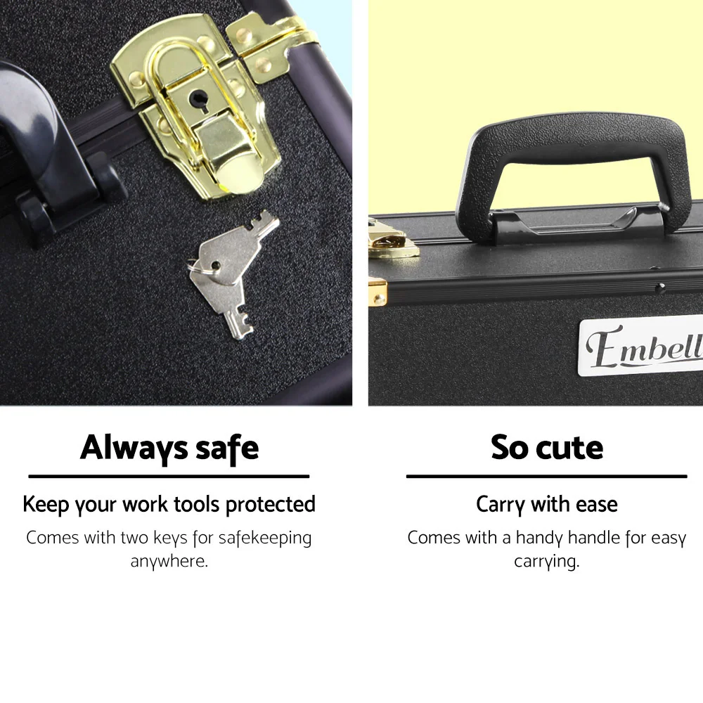 The Embellir Portable Cosmetic Beauty Makeup Case in Black & Gold is your ultimate travel companion for beauty on-the-go. Designed for professionals and enthusiasts alike, this case combines elegance with functionality. Its lightweight design and optional shoulder strap make it easy to carry, while the Grade-A aluminium frame ensures durability. With a luxurious black velvet interior, 4 sliding trays, and customised dividers, it offers ample storage for all your essentials, secured with a safety lock.