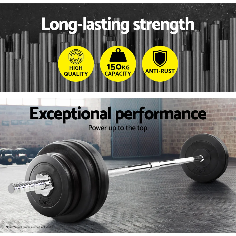 Elevate your home workout regimen with the Everfit 168CM 5.5FT Barbell Bar. Crafted from solid chrome-plated steel, this versatile barbell is designed to fit most standard 31mm - 35mm hole weight plates and supports up to 150kg, making it perfect for various strength training exercises. It features a knurling design for enhanced grip and includes 2 spring collars to keep your plates secure. Adjustable barbell plates distance from 91cm-105cm and detachable for easy storage, this barbell offers convenience and safety. Start your fitness journey at home without hassle. Get yours today!