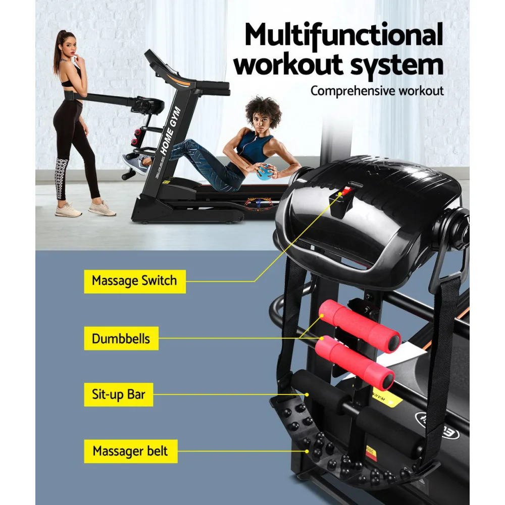 Experience versatile home workouts with the Everfit Treadmill Electric Home Gym Fitness Exercise Machine. Designed with a sturdy powder-coated steel frame, this compact treadmill features a spacious 480mm anti-slip running belt, 12 pre-set programs, 18 speed levels, and a powerful 3.5hp motor for smooth operation. Enjoy a comfortable session with double shock absorption, 15-level auto inclination, pulse sensors, and a user-centric LCD panel. The multi-functional system includes a massage belt, sit-up bar, and dumbbells, ensuring a complete fitness solution at home.