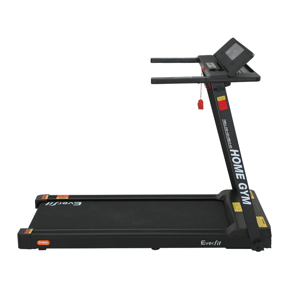Achieve your fitness goals at home with the Everfit Electric Treadmill. Designed with a sturdy powder-coated steel frame, this fully foldable treadmill features a high-strength composite running board and a spacious anti-slip belt for a comfortable workout. Choose from 12 pre-set training programs and speeds between 1km/h and 14km/h on the user-friendly LCD panel. With a soft-grip handlebar, safety tether key, smooth wheels, and a tablet holder, you get a secure, convenient, and motivating exercise experience every time.
