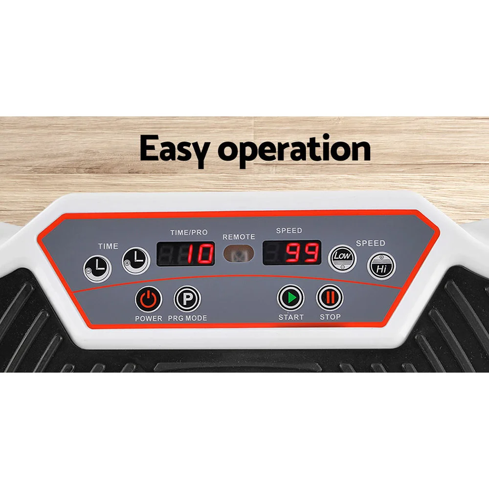 Elevate your fitness routine with the Everfit Vibration Machine Platform Vibrator. In just 15 minutes, achieve the benefits of a workout that's equivalent to 60 minutes of jogging. Target your waist, thighs, legs, arms, butt, and back with ease using the digital controls for time, speed, and intensity. Equipped with a powerful dual-belt motor, it ensures efficient calorie burning. With a robust weight capacity of 180kg, it's perfect for all fitness levels. This versatile machine includes resistance bands for enhanced workouts. Its sleek white design, anti-slip surface, and easy operation make it an ideal home fitness solution.