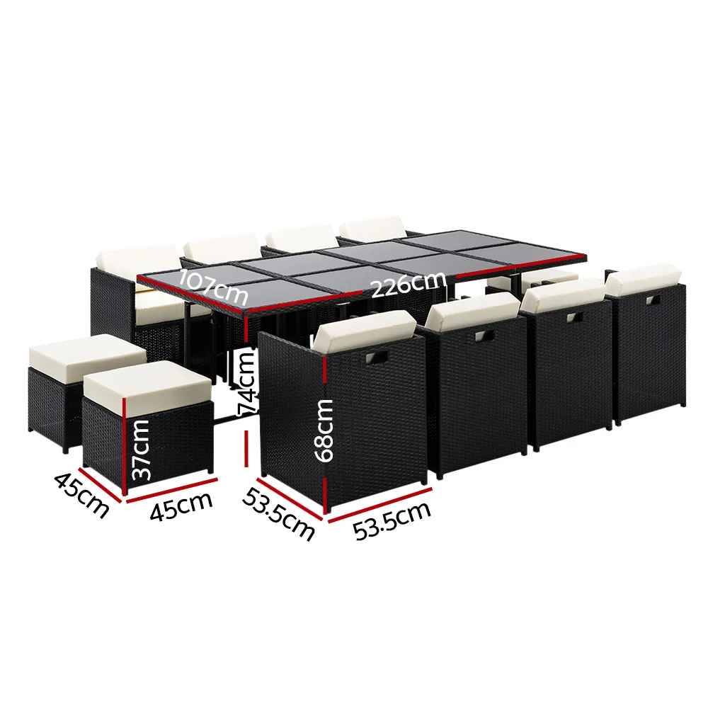 Embrace outdoor elegance with the Gardeon Hayman 13-Piece Outdoor Dining Set. Perfect for gatherings, this set features a powder-coated aluminium frame wrapped in UV-resistant PE wicker, ensuring durability in all weather. The 5mm tempered glass table top and high-density foam cushions enhance comfort and style. Enjoy versatility with three interchangeable cushion covers in red, grey, and beige, plus a waterproof storage cover. Easily rearrange chairs for a fresh layout anytime. Assembly required.