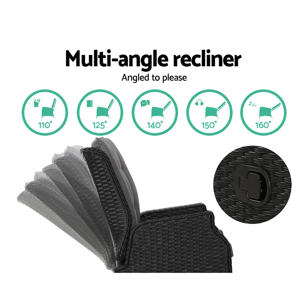 Gardeon 2PC Black Wicker Recliner Set: UV-Resistant, Adjustable, Steel Frame, High-Density Cushions, Indoor/Outdoor Use