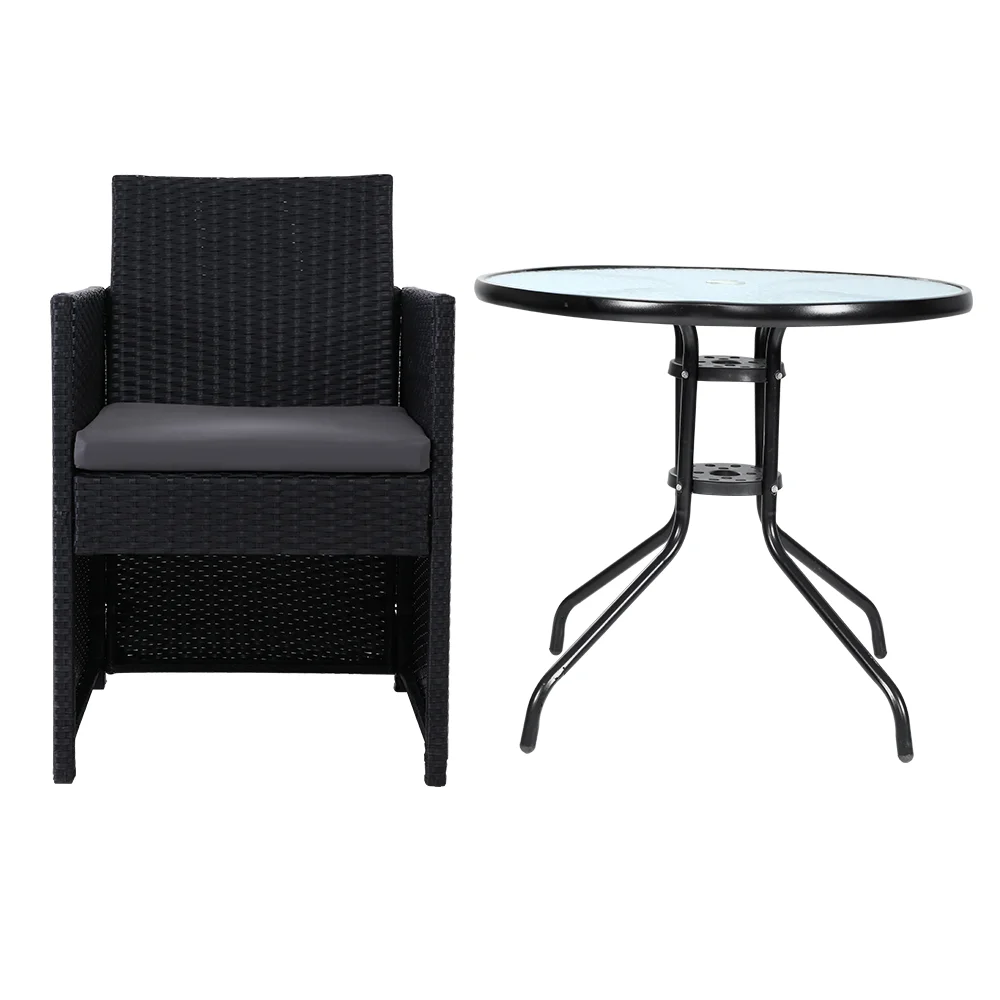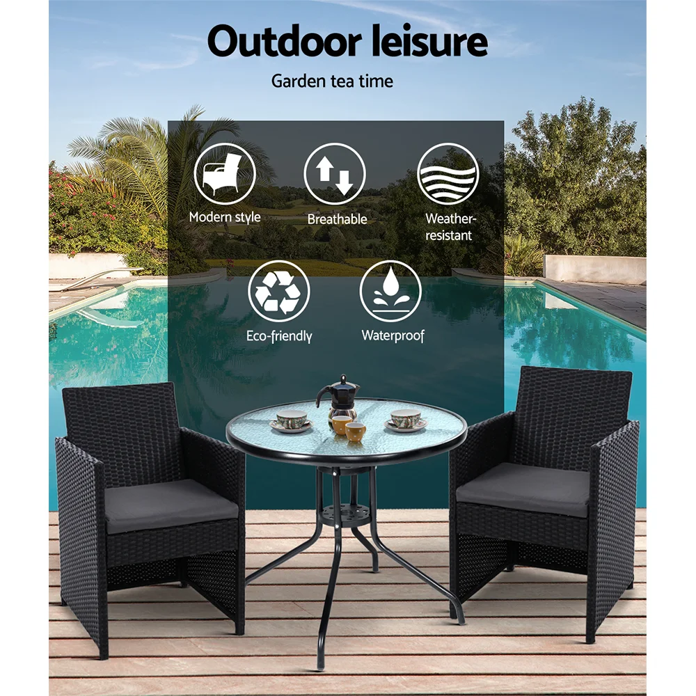 Gardeon 3PC Outdoor Patio Bistro Set - UV-Resistant Wicker, Steel Frame, Glass Table, Cushioned Chairs, Weatherproof
