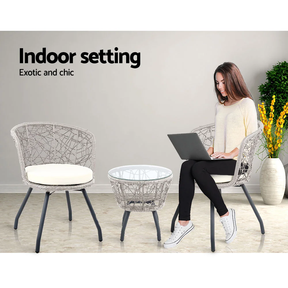 Gardeon 3PC Outdoor Bistro Set with Weather-Resistant Rattan, Tempered Glass Table, and Cushioned Grey Chairs for Patio