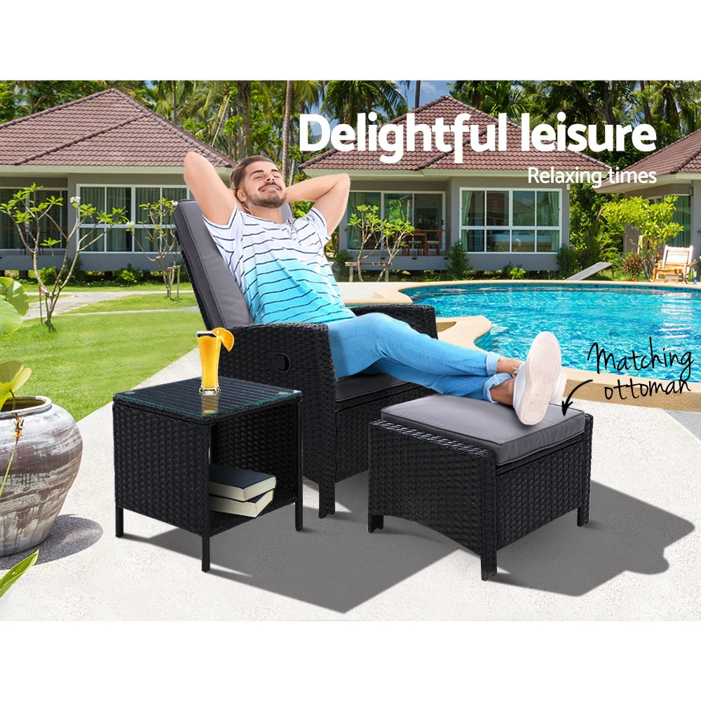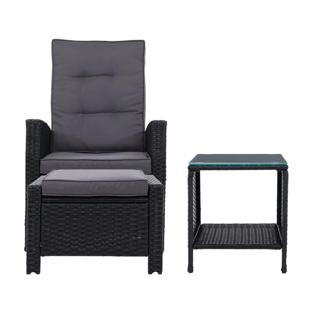 Gardeon 3PC Recliner Set: Black Wicker Outdoor Furniture with Adjustable Backrest, Ottoman, & Tempered Glass Table