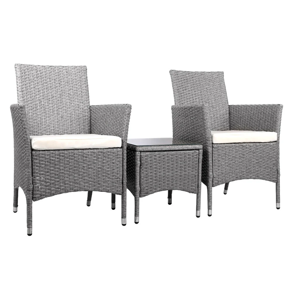 Gardeon 3PC Outdoor Bistro Set - Grey Wicker Chairs & Table with Cushions, Steel Frame, UV & Weather Resistant