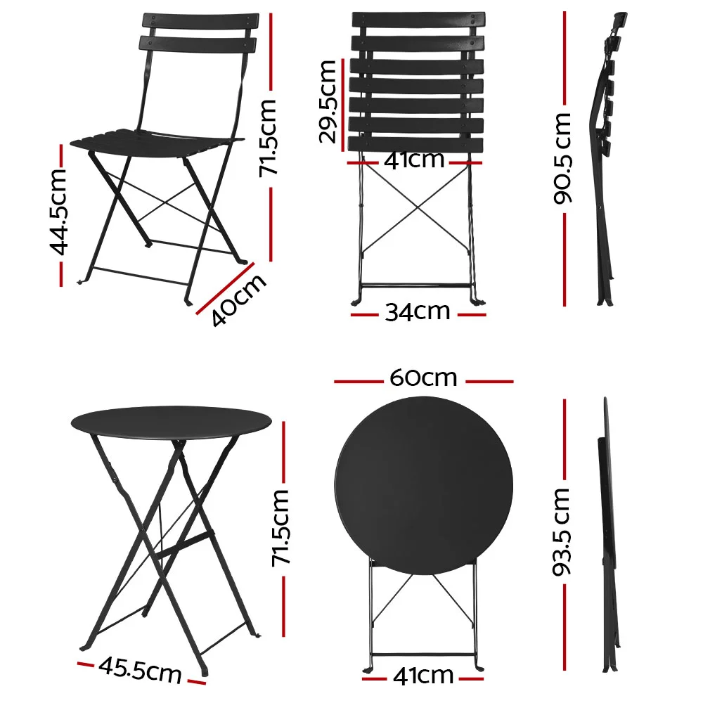 Gardeon 3PC Outdoor Bistro Set - Black Steel, Foldable, Weather-Resistant, No Assembly, 150kg Chair Capacity, 60cm Table