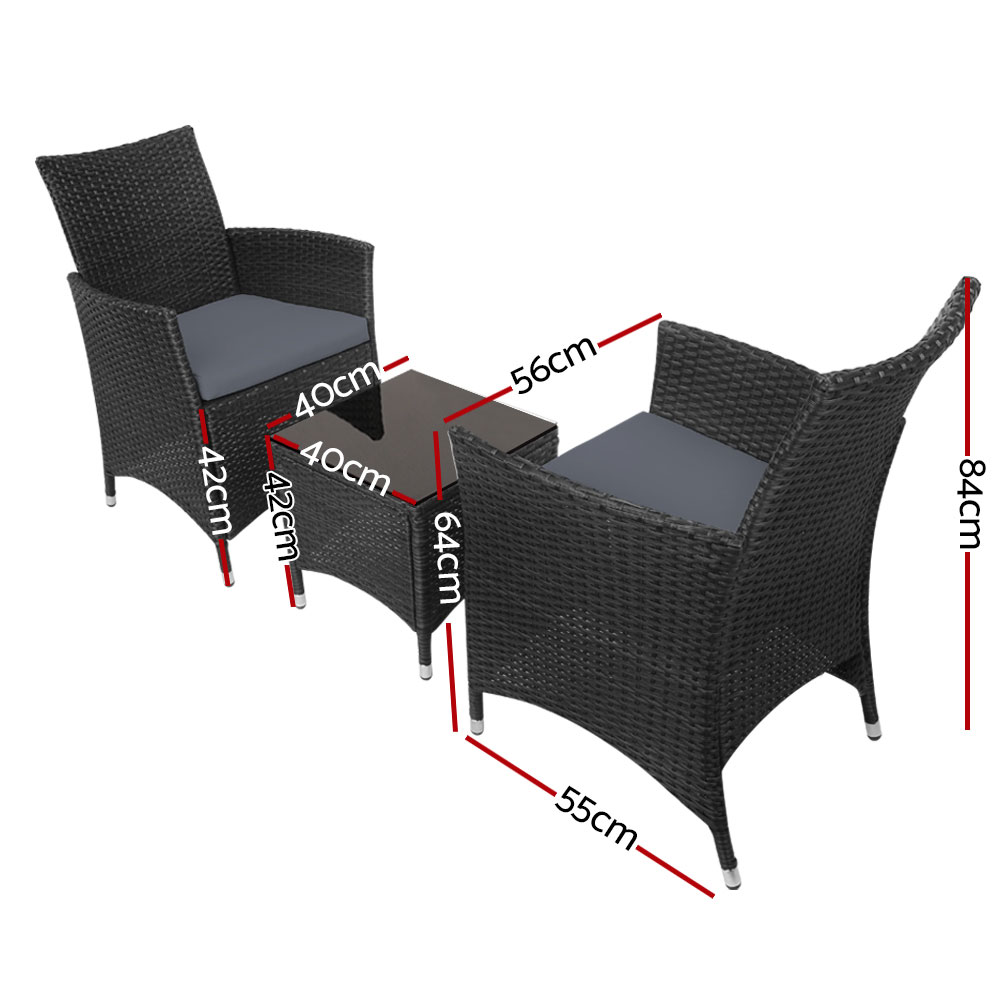 Gardeon 3PC Outdoor Bistro Set - Black Wicker Chairs & Glass Table, Weatherproof, UV-Resistant, Cushioned Comfort