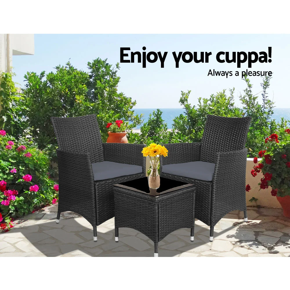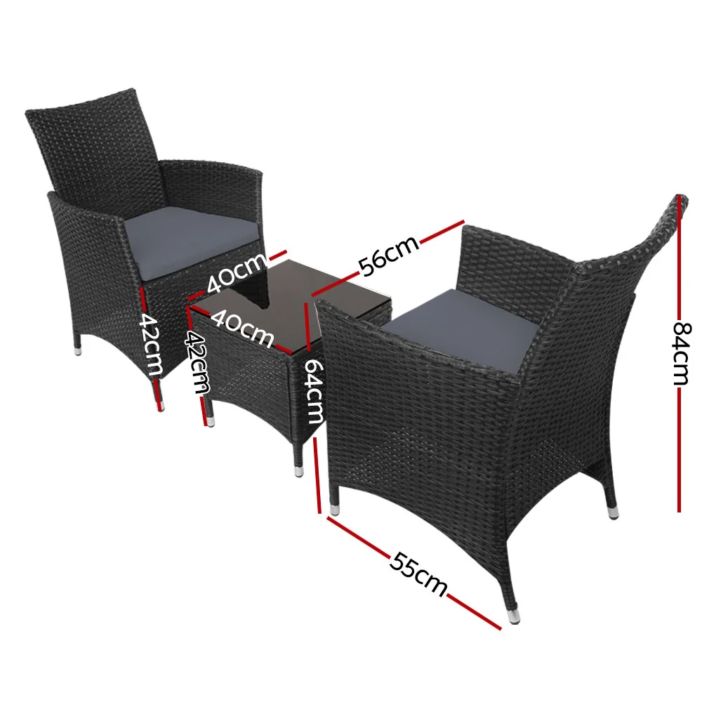 Gardeon 3PC Outdoor Bistro Set - Black Wicker Chairs & Glass Table, UV & Weather Resistant, Cushioned Comfort