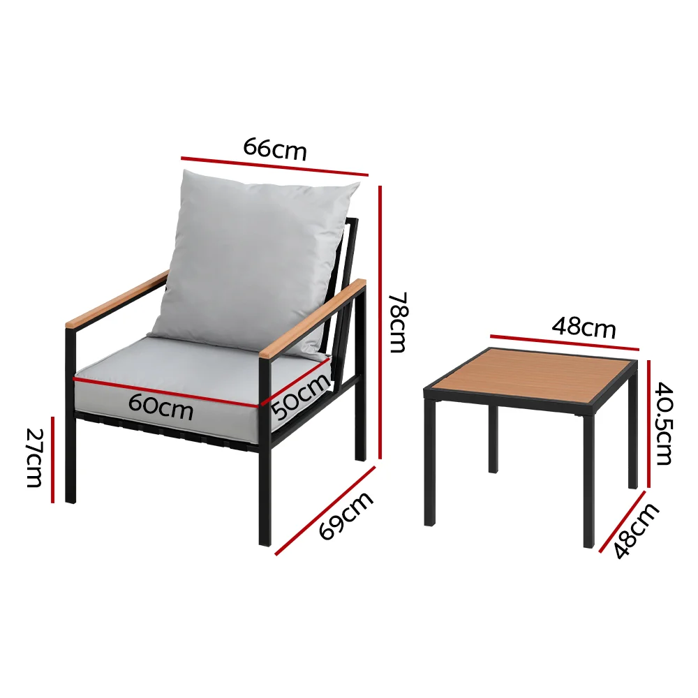Experience outdoor luxury with the Gardeon 3PC Outdoor Furniture Bistro Set. This elegant ensemble includes two single chairs and a coffee table, crafted from rust-resistant powder-coated steel. The set features water and UV-resistant cushions with plush 8cm foam, ensuring comfort. Easy to assemble, it boasts non-slip feet and a durable Polywood tabletop. Maintenance is a breeze with wipe-clean surfaces and removable cushion covers. Elevate your outdoor living with Gardeon, backed by a 1-year warranty.
