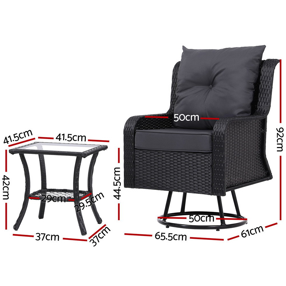 Gardeon 3PC Black Wicker Outdoor Furniture Set - Swivel Chairs & Table with Cushions, Durable Steel Frame, UV-Resistant