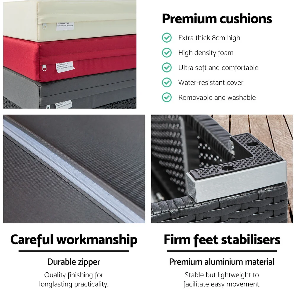 Indulge in ultimate relaxation with the Gardeon 3PC Sun Lounge Wicker Lounger. This chic outdoor furniture set is crafted from durable, weather-resistant materials, perfect for basking in the sun. Its elegant design features a UV-resistant frame, 8cm thick water-resistant cushions, and an adjustable backrest. Whether sunbathing or unwinding, this set is your go-to for endless summer moments. Available in Beige, Grey, or Red, it includes storage cubes and covers, offering style and practicality.