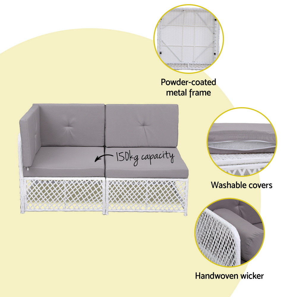Transform your garden or patio with the Gardeon 4 Seater Outdoor Sofa Set. This stylish 5-piece ensemble features two corner sofas, a single sofa, ottoman, and matching centre table, all crafted in elegant handwoven white PE wicker with plush grey cushions. Designed for comfort and versatility, you can arrange the set to fit any space, indoors or out. The powder-coated metal frame and UV-resistant materials ensure lasting durability, while the low maintenance design makes entertaining easy. Create a sophisticated, inviting retreat and impress your guests with this chic outdoor set.