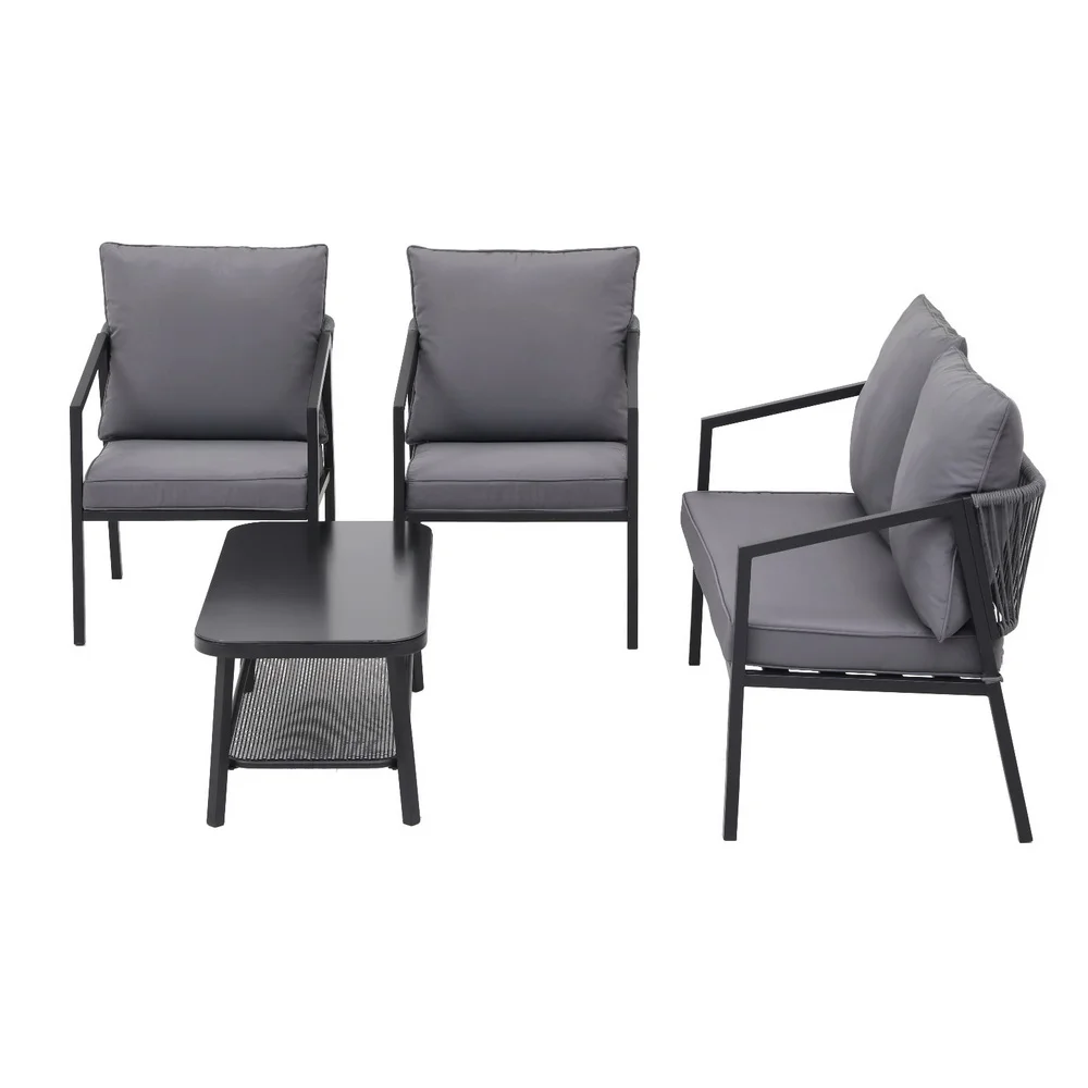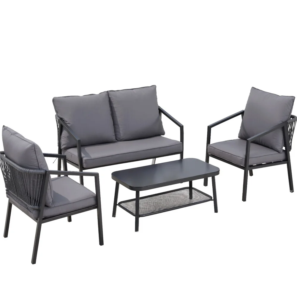 Gardeon 4PC Outdoor Sofa Set - Steel Frame, Rope Backrest, Tempered Glass Table, Water-Resistant Cushions, 4-Seater