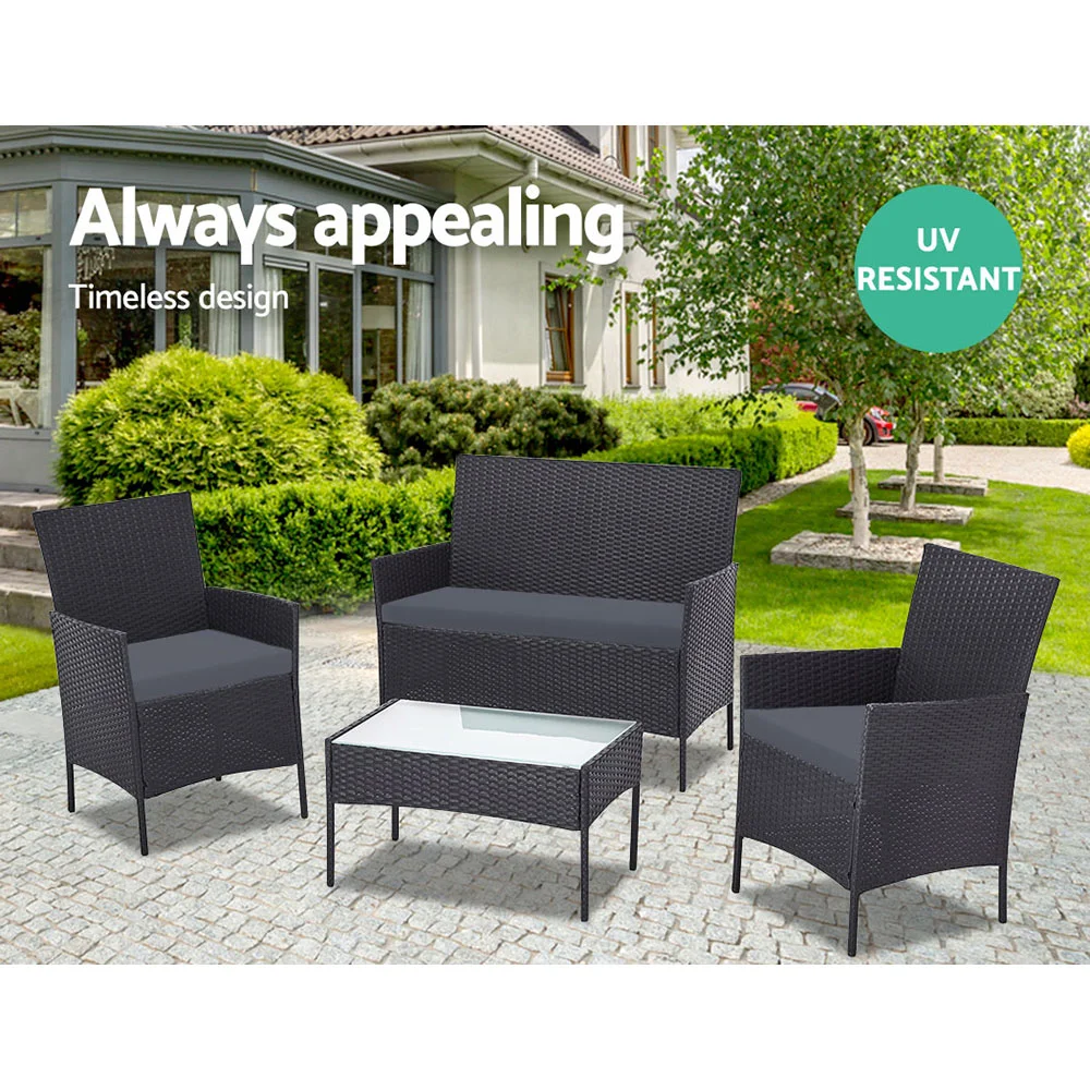 Gardeon 4-Piece Outdoor Sofa Set - Black Wicker with Cushions, Steel Frame, Tempered Glass Table, Weather-Resistant