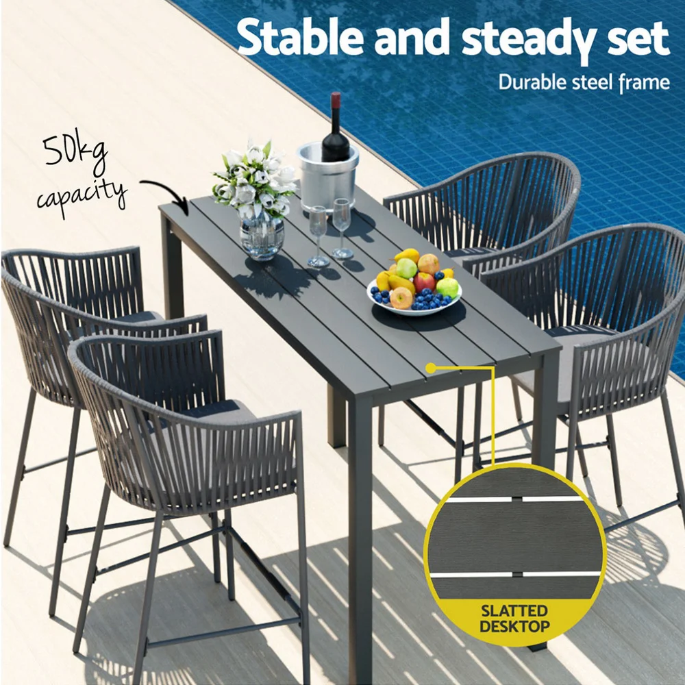 Experience outdoor luxury with the Gardeon 5-Piece Outdoor Bar Set. Featuring four chairs and a coffee table, this set is crafted from powder-coated steel and hand-woven rope for durability. Enjoy plush comfort with water-resistant cushions and a slanted backrest. Easy assembly, non-slip feet, and a slatted tabletop make it perfect for any setting. Transform your patio into a stylish retreat today.