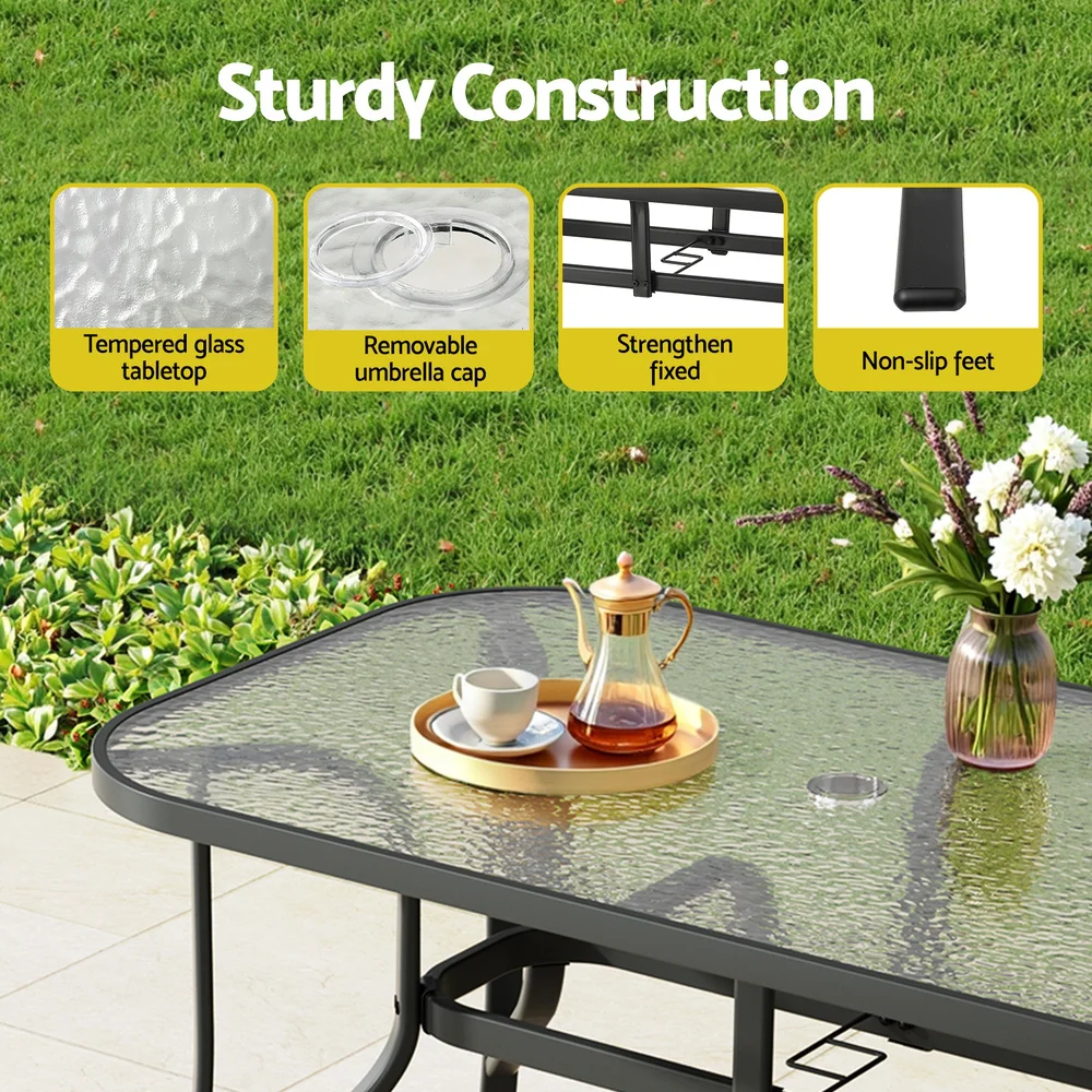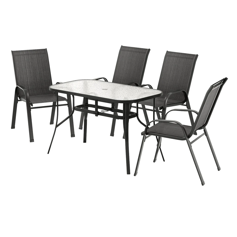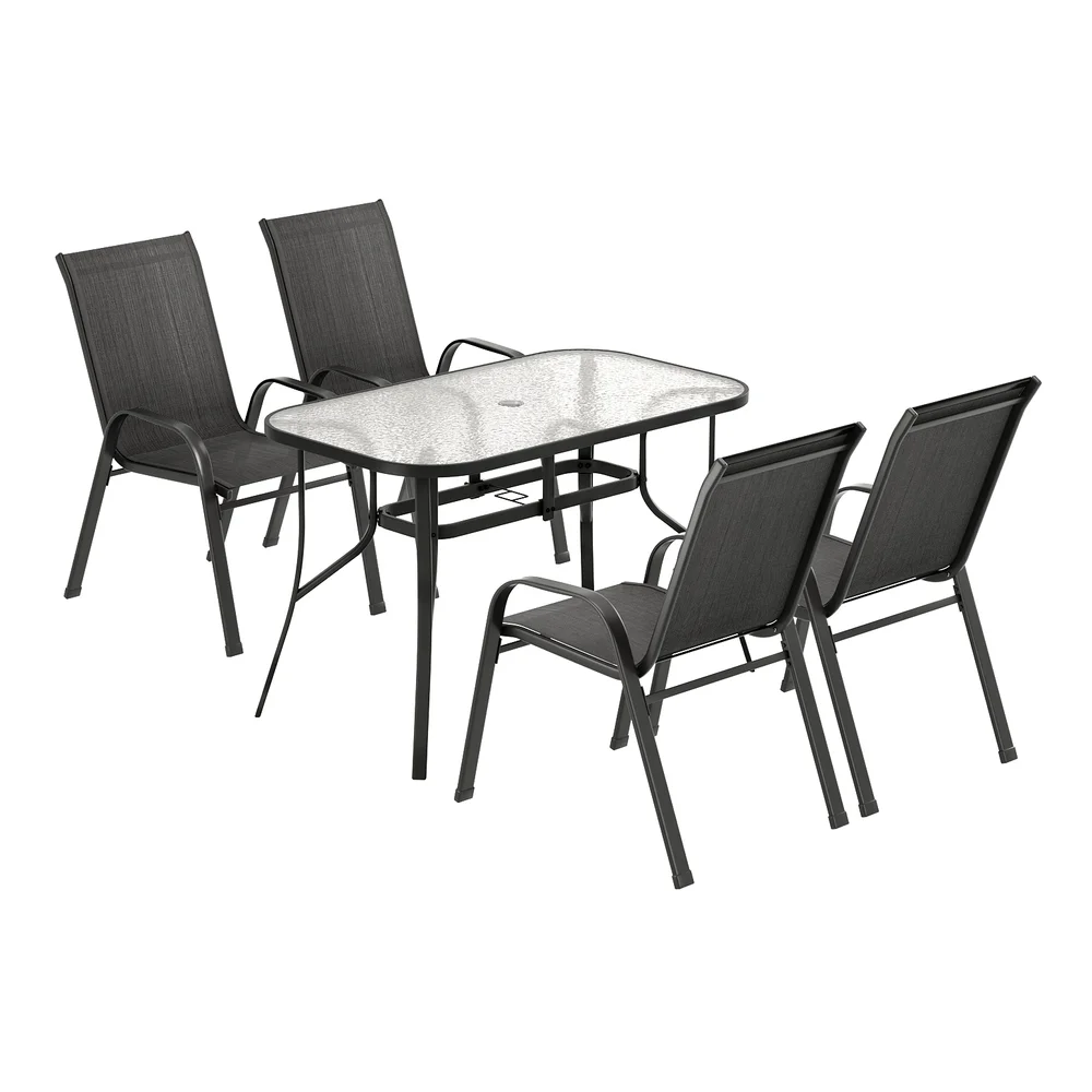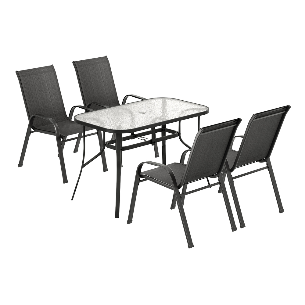 Transform your patio or garden into a stylish retreat with the Gardeon 5 Piece Outdoor Dining Set. Crafted with a sturdy, powder-coated steel frame and premium textilene fabric, this set offers lasting comfort and durability. The spacious tempered glass table features a built-in parasol hole for sunny days, while stackable chairs save space when not in use. Easy to clean and designed for both indoor and outdoor use, this sleek black set is perfect for relaxing alfresco meals with family and friends.