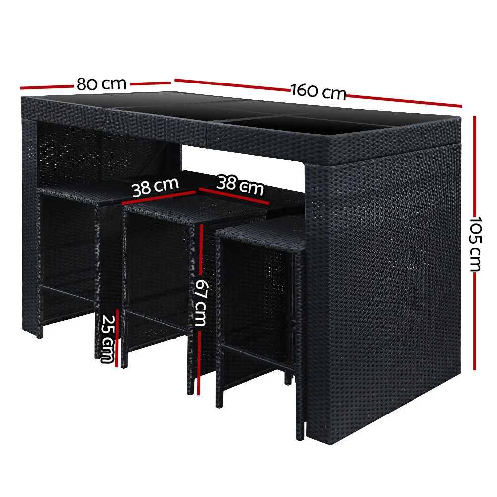 Transform your outdoor space with the Gardeon 7-Piece Outdoor Bar Set, featuring a chic black PE wicker design and sturdy powder-coated steel frame. This stylish set comfortably seats six, with 5cm thick foam cushions for added comfort. The tempered glass table top offers durability, while the integrated design allows stools to be stored underneath, saving space. Weather-resistant and UV-resistant, this set is built to withstand the elements, ensuring years of enjoyment. Perfect for summer gatherings!