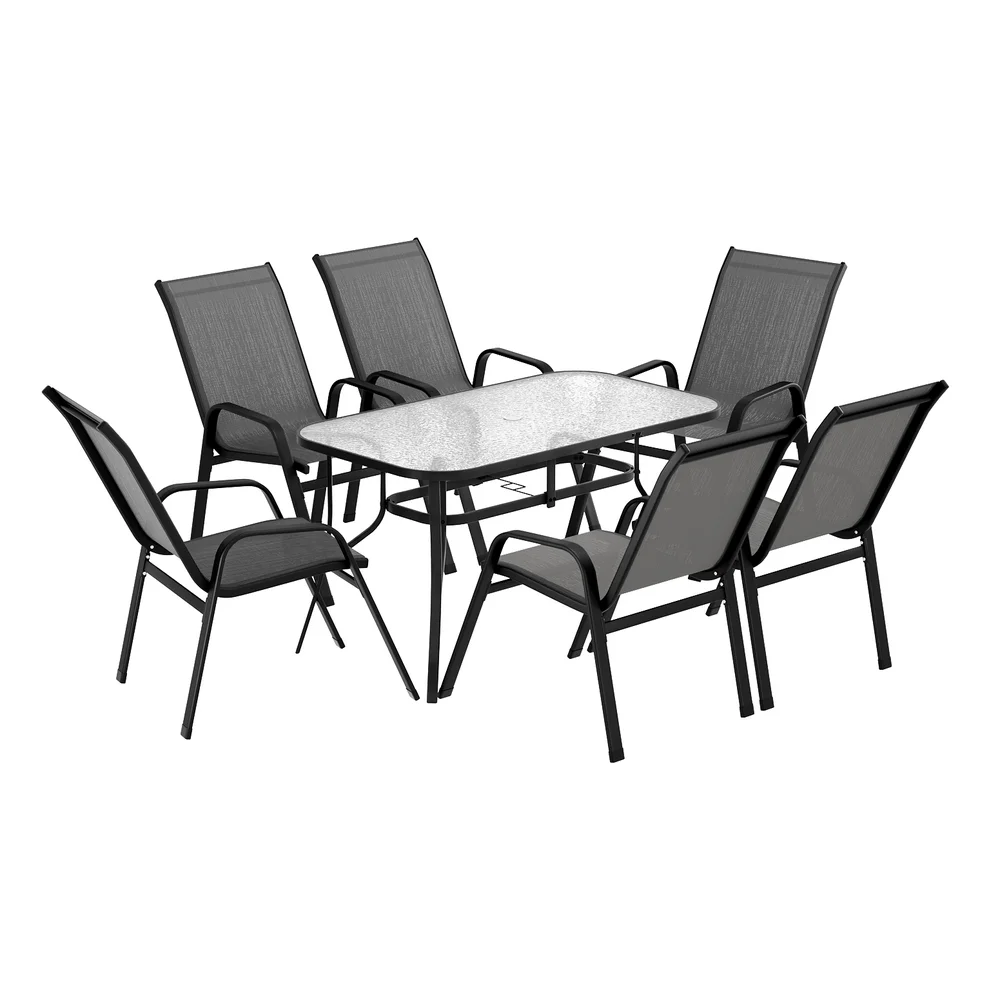 Transform your patio into a stylish dining retreat with the Gardeon 7 Piece Outdoor Dining Set. Built with a powder-coated steel frame for lasting strength, this set features six stackable chairs in premium, weather-resistant textilene fabric and a spacious tempered glass table with a handy parasol hole. Its sleek grey finish suits any decor, while anti-slip rubber feet ensure stability and protect floors. Easy to clean and suitable for both indoor and outdoor use, enjoy comfortable alfresco meals with friends and family all year round.