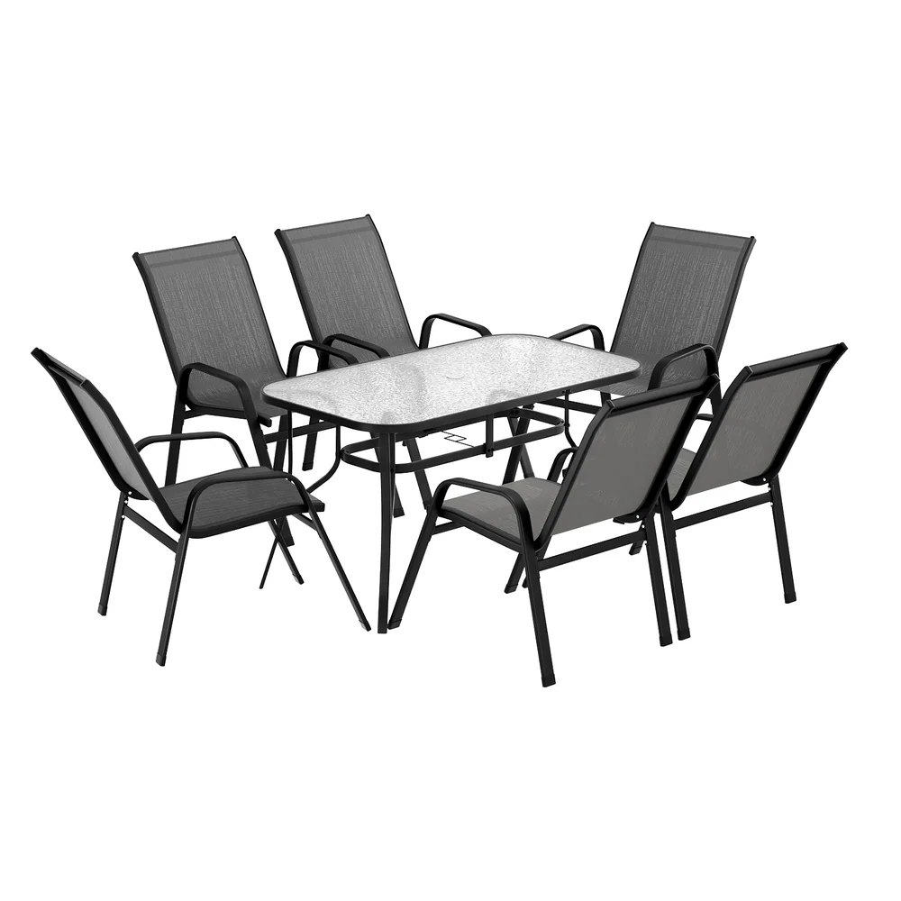 Transform your patio or garden into a stylish entertaining space with the Gardeon 7 Piece Outdoor Dining Set. Designed for durability and comfort, this set features a rust-proof powder-coated steel frame and premium textilene fabric, ensuring vibrant colour and weather resistance. A spacious tempered glass table with a built-in parasol hole offers convenience and elegance, while stackable chairs and anti-slip rubber feet provide space-saving versatility and stability. Perfect for both indoor and outdoor dining, it’s easy to clean and maintain for effortless alfresco living.